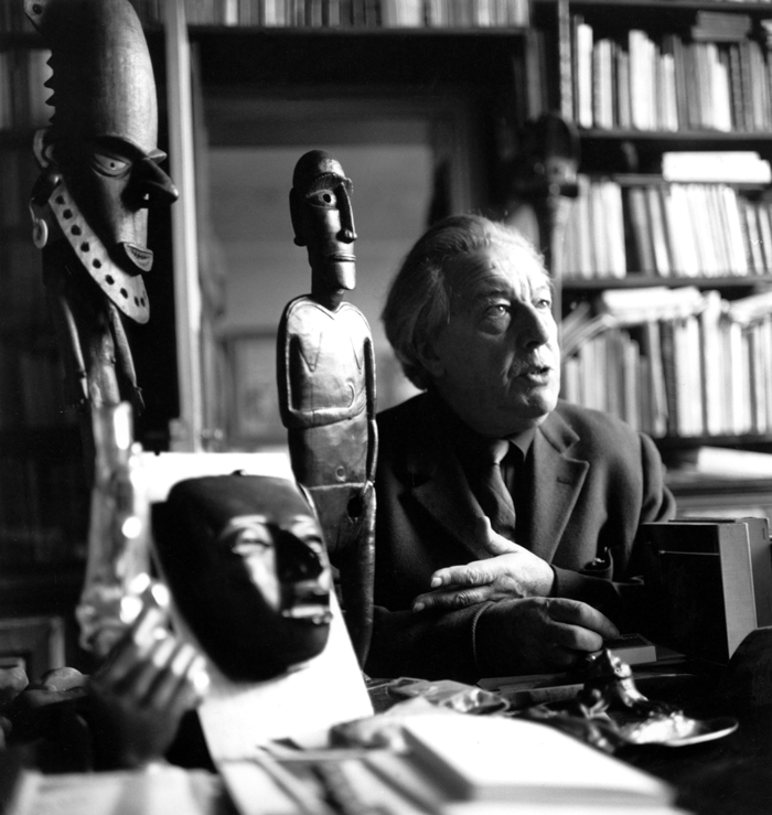 André Breton mit Maske in seiner Bibliothek, Paris (1965)