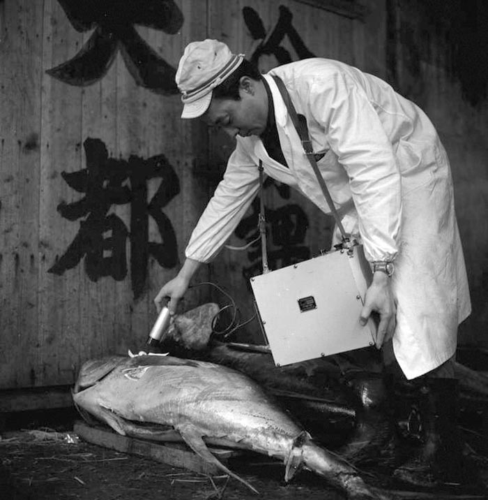 Der Geigerzähler im Fischmarkt von Tokio, Japan (1960)