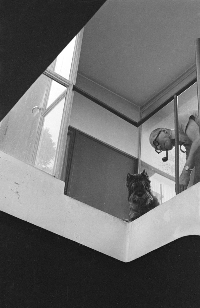 Le Corbusier mit Hund Jimmy im Treppenhaus, Paris (1936)