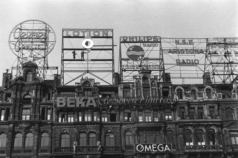 Leuchtreklame auf den Dächern einer Häuserzeile, Brüssel (1942)