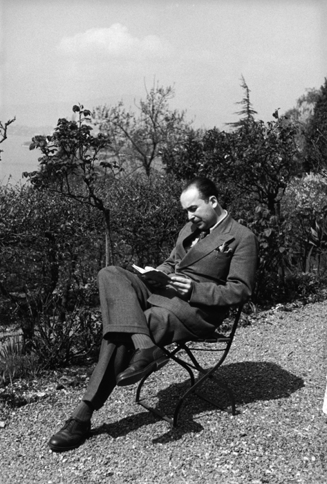 Paul Almasy lesend im Garten in Genf, Schweiz (1936)