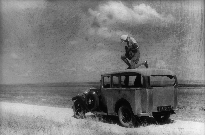 Paul Almasy mit dem Automobil in der Savanne, Kenia (1939)