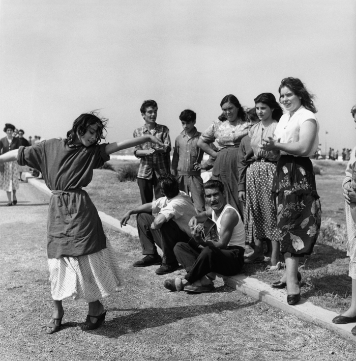 Roma-Mädchen tanzt in Saintes-Maries-de-la-Mer, Frankreich (1965)