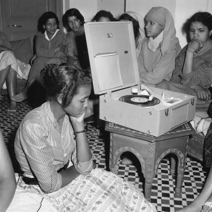 Schülerinnen mit Plattenspieler, Marokko (1955)