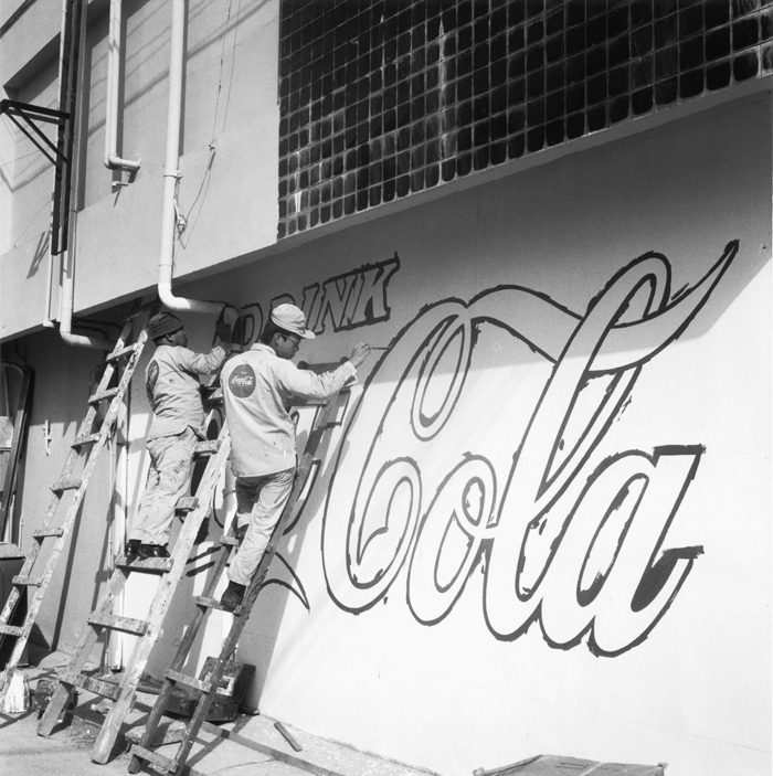 Slogan 'Drink Coca Cola' an einer Hauswand in Okinawa, Japan (1970)