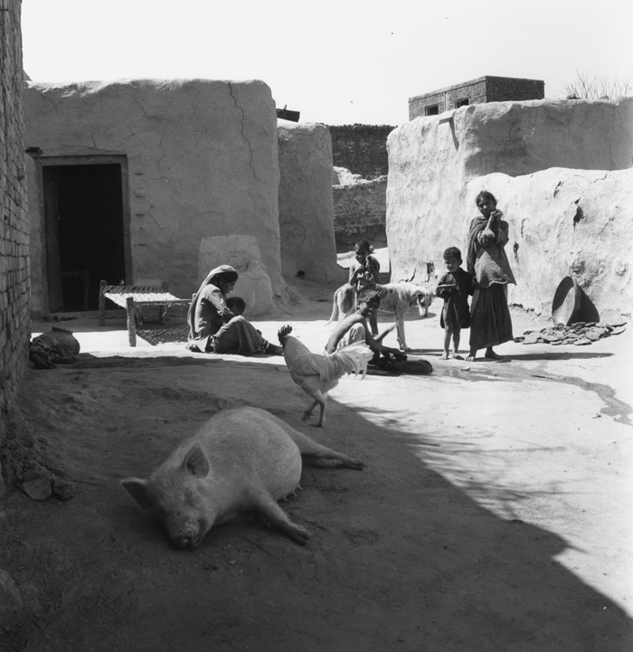 Szene vor einer Hütte in Bihar, Indien (1950)
