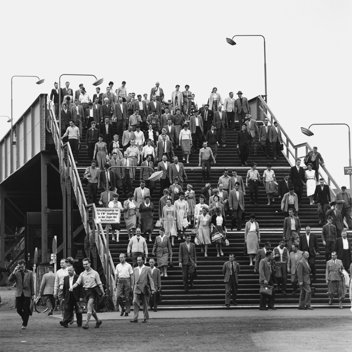 VW-Fabrikarbeiter auf Heimweg, Wolfsburg (1954)